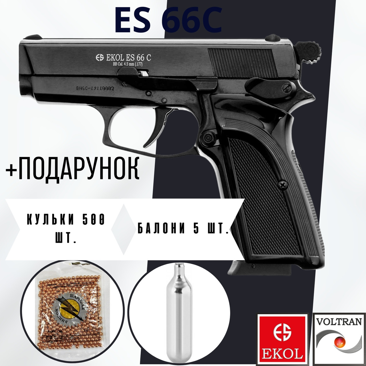 EKOL ES 66 Compact — пневматичний СО2 пістолет від турецької компанії Voltran. Вага пістолета становить 970 грамів, оскільки корпус и затворна рама виготовлені з металевого сплаву. Водночас завдяки чудовому балансуванню конструкції така висока маса не створює дискомфорту під час стрільби своїми формами й тактильно цей пневматичний пістолет скидається на травматичну або бойову зброю. EKOL ES 66 C має мінімум рухомих частин (без блоубок), що не робить його "брязкальцем" в чоловічих руках.